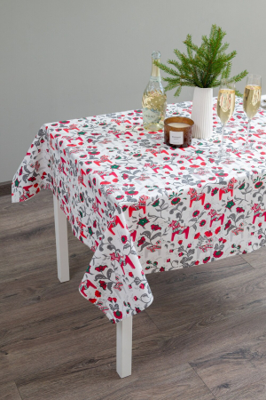 Уникальный дизайн: Скатерть выполнена в традиционном стиле Городецкой росписи. Белый фон украшен яркими красными лошадками, символами наступающего 2026 года, и зимними атрибутами, создающими атмосферу праздника и радости.