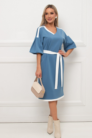 Женственное платье прямого силуэта. V - образная горловина на внутренней обтачке оформлена вставкой. Втачной рукав - фонарик со спущенным плечом. Низ ровный, оформлен притачной манжетой, сзади шлица. Пояс из основного материала входит в комплект.