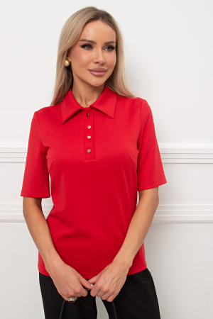 Комфортная блузка полуприлегающего силуэта из трикотажного полотна. Втачной рукав до локтя. Отложной воротник. Перед оформлен планкой с застежкой на петли и пуговицы. Низ ровный, без разрезов.