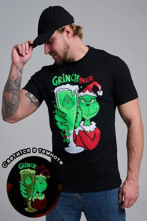 Чёрная хлопковая футболка с забавным принтом: Гринч в красной шапке держит большой бокал пива с пеной! Надпись Grinch Beer сверху, яркий зелёно-красный дизайн для новогоднего юмора.