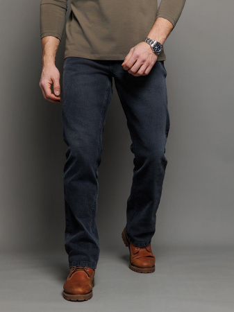 Мужские классические джинсы с пятью карманами. Посадка Regular fit (полуоблегающие по бедру), высокая талия. Застежка на молнии. Немного заужены в колене и по низу. Выполнены из толстой слабоэластичной ткани denim comfort stretch цвет ткани Black/Black (лицевая и изнаночная стороны ткани черные). Темная стирка с потёртостями и "усами" спереди и потёртостями сзади.