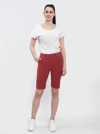 Женские классические шорты Chinos. Посадка Regular fit (полуоблегающие по бедру), заужены к низу. Высокая талия. Застежка на молнии. Сзади прорезные карманы "в листочку". Выполнены из отбеленной эластичной мягкой ткани gabardine stretch. Изделие постирано в готовом виде после пошива. Параметры указаны для размера 28. Длина внутреннего шва для всех размеров - 28,0 см.