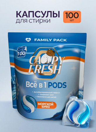 Средство для стирки Capy Fresh с ароматом морской бриз- это стиральные капсулы, которые предлагают решение для эффективной и бережной стирки одежды. В каждой находится уникальный гель и формула, в составе которой антибактериальный эко компоненты с пятновыводителем и кондиционером. Такое сочетание компонентов обеспечивает мощное очищение против пятен, защиту цвета и уход за тканью. Мягкость, свежесть и дополнительные преимущества, такие как предотвращение образования катышков, облегчение глажки и антистатический эффект, достигаются благодаря кондиционеру, входящему в состав капсулы.