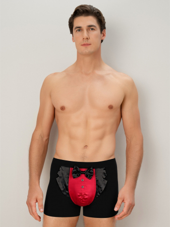 Главная особенность — контрастный красный жилет на передней части: он имеет два пуговицы, лацканы и украшен изящной черной атласной бабочкой.