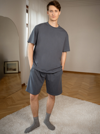Мужская пижама Indefini выполнена в универсальном тёмно-сером цвете. Комплект состоит из классической футболки с коротким рукавом и круглым вырезом, а также свободных шорт на мягкой эластичной резинке с регулируемым шнурком и боковыми карманами.