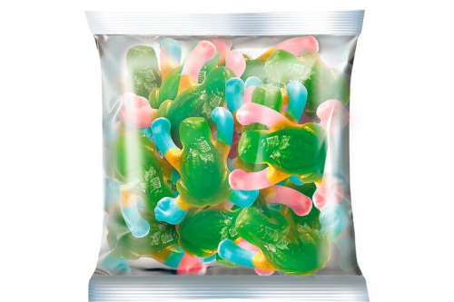 Состав продукта: глюкозно-фруктозный сироп, сахар, желатин, концентрированный яблочный сок, регулятор кислотности лимонная кислота, агент желирующий – пектины, глазирователь – воск карнаубский, ароматизатор, красители- каротины, медные комплексы хлорофиллинов, куркумин, синий блестящий FCF; концентрированный сок черной моркови. Продукт может содержать диоксид серы.