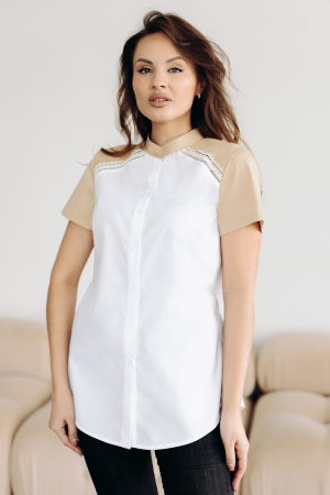 Лаконичная удлиненная блузка с цветной кокеткой и рукавами.