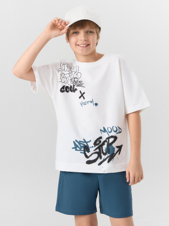 Стильный комплект для мальчиков. Состоит из футболки и шортов. Выполнен из высококачественного хлопка. Футболка прямого свободного силуэта, длиной до середины бедер, с круглой горловиной и короткими рукавами. Шорты длиной до колен или чуть выше, свободные, с боковыми карманами. В пояс из рибаны вставлен регулировочный шнур. Отличный вариант для повседневной носки, прогулок и путешествий. Широкий размерный ряд. Рекомендуем!