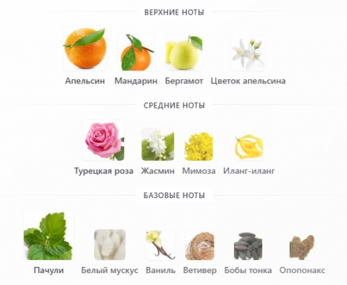 Верхние ноты: Апельсин, Мандарин, Бергамот и Цветок апельсина; средние ноты: Турецкая роза, Жасмин, Мимоза и Иланг-иланг; базовые ноты: Пачули, Белый мускус, Ваниль, Ветивер, Бобы тонка и Опопонакс