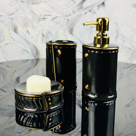Набор аксессуаров для ванной комнаты состоит из трех предметов: мыльница, дозатор для жидкого мыла, стакан зубных щеток, . Набор выполнен из высококачественного фарфора с черной эмалью, золотым декором и золотыми элементами