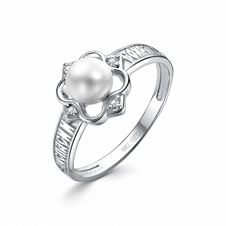 Кольцо (Спаси и Сохрани) из серебра родированное литье с иск.жемчугом (арт. 10-2562)