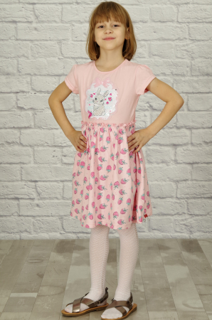 Симпатичное хлопковое платье для девочки. Модель с коротким рукавом и отрезной юбкой. Полочка однотонная, украшена оригинальной аппликацией. Отличный вариант на выход и на каждый день!