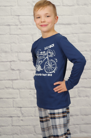 Удобный хлопковый костюм для мальчиков подойдёт и для сна, и для домашних игр. Футболка однотонная, прямого кроя с длинным рукавом, на полочке печатный принт. Брюки в клетку, снизу на эластичных манжетах, пояс на резинке.