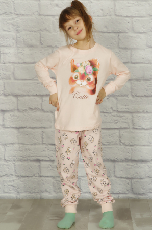 Симпатичная, нежная хлопковая пижама для девочек. Такой комплект подойдёт и для сна, и для домашних игр. Футболка однотонная, прямого кроя с длинным рукавом, на полочке печатный принт "бельчонок". Брюки с набивным рисунком, снизу на эластичных манжетах, пояс на резинке. Ткань кулирка - комфортная для сна и приятная к телу.
