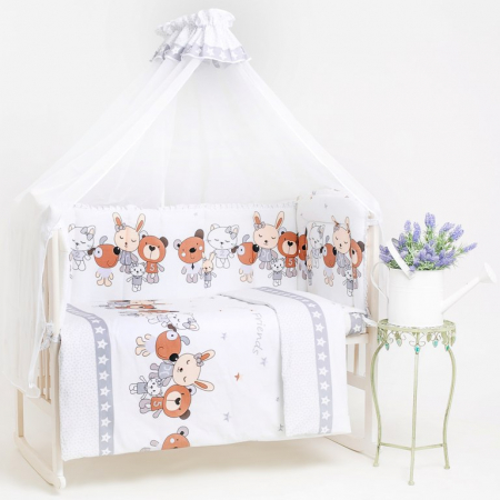 Комплект в детскую стандартную кроватку с мягкими бортиками и балдахином. Такой набор создаст настоящий уют и тепло спальному "гнёздышку". Ткань поплин люкс, плотностью 115 г/м2, наполнитель безопасный и современный материал термофайбер, не вызывающий аллергию. Набор упакован в прозрачную сумку. Прекрасный вариант для подарка на рождение ребёнка!