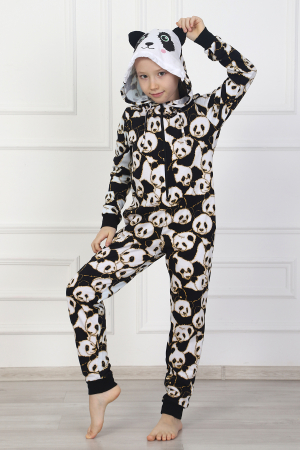 Комбинезон детский на молнии из набивного полотна, с капюшоном, стилизованный в виде животного - панды, двумя боковыми карманами в швах. Рукава втачные на манжетах. На капюшоне принт, шнурок. Манжеты выполнены из отделочной ткани.