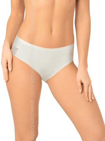 Трусы макси-слип с высокой линией талии. Передняя деталь выполнена из мягкой микрофибры, задняя деталь - из декоративного полотна с чередующимися полосками разной ширины. Спереди вырез ножки обработан с использованием технологии "лазерный край". Линия талии проклеена вподгибку. Хлопковая ластовица притачана к изделию потайным швом. Благодаря особенностям обработки материалов изделие абсолютно незаметно под одеждой.
