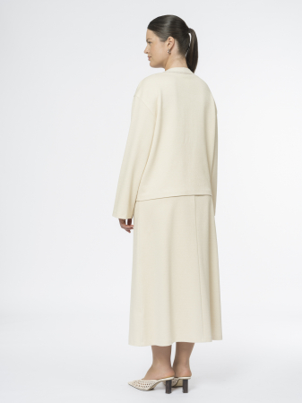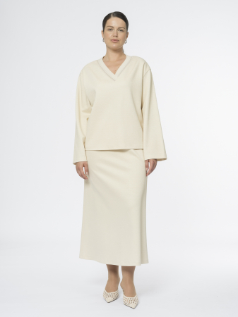 V-образный вырез украшен аккуратным подвязом – это добавляет модели изящную деталь. Спущенное плечо и втачной рукав делают силуэт расслабленным, но аккуратным. Молочный оттенок выглядит нежно и универсально.