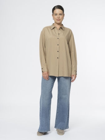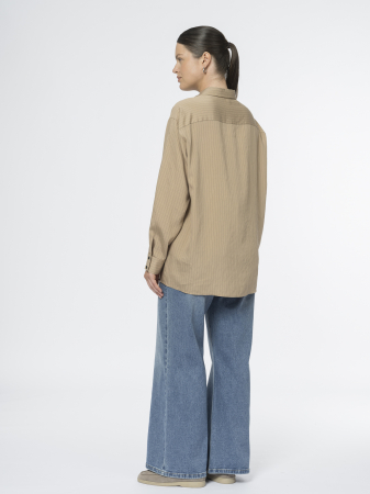Блуза бежевая в тонкую полоску прекрасно дополнит гардероб как соло, так и подойдет в качестве второго слоя.