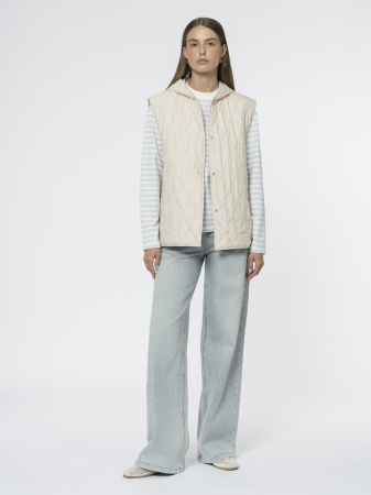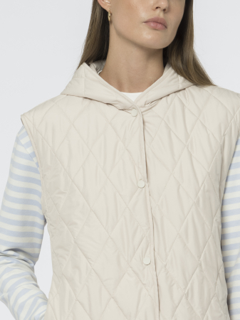 Удобный жилет-безрукавка в актуальном цвете мела – идеальный вариант для прохладной погоды. Сшит из практичной плащевки с влагозащитной пропиткой, которая убережёт от внезапного дождя и ветра. Внутри – лёгкий синтепон, зафиксированный аккуратной стёжкой в виде ромбов. Эта технология не только удерживает утеплитель на месте, но и добавляет жилету стильный внешний вид.
