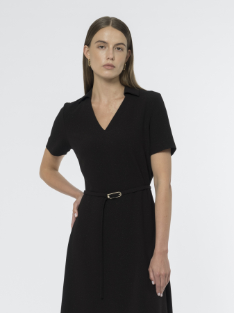 Платье с легким расклешением – идеальный вариант для создания женственного образа. Аккуратный V-вырез с отложным воротником без лацканов подчеркивает шею, добавляя образу лёгкую строгость. Короткие втачные рукава удобно облегают плечи, не сковывая движений.