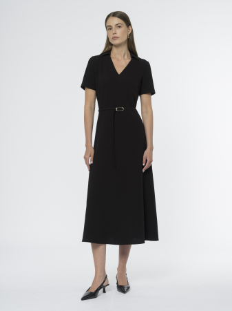 Модель сшита из практичной поливискозной ткани с добавлением эластана: материал сохраняет форму и не мнётся. В дополнение - пояс из основной ткани платья
