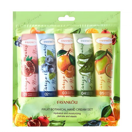 Набор кремов для рук FAYANKOU – это фруктовый эликсир для вашей кожи. Он увлажняет и успокаивает сухую кожу рук. Ваши руки станут нежными и сияющими. Кожа приобретет гладкость и здоровый вид. В наборе пять восхитительных кремов. Каждый крем обогащен натуральными фруктовыми экстрактами.