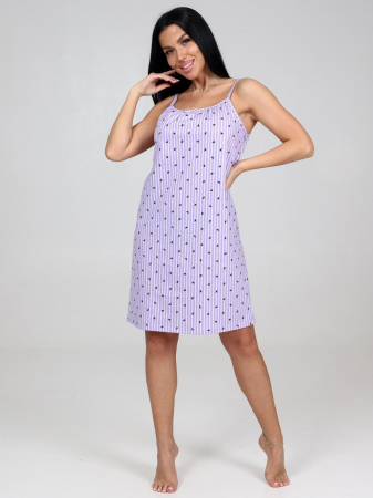 Сорочка Алиссум полуприлегающего силуэта из набивного трикотажного полотна "кулирка", длиной чуть выше линии колена, на тонких бретелях, без рукава, по линии горловины переда сборка. Горловина переда и спинки округлой формы, проймы и бретель обработаны косой бейкой. Сорочка украшена атласным бантиком.