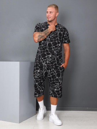 Костюм состоит из футболки и шорт. При пошиве использовано трикотажное полотно кулирка с мраморным рисунком. Футболка мужская с втачным рукавом. Горловина обработана обтачкой в цвет изделия. Низ рукава и низ изделия обработаны швом в подгибку.
