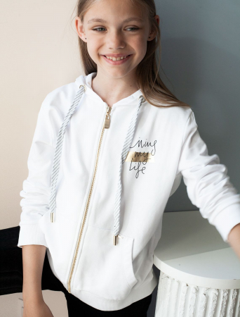 Белое худи на молнии с длинными рукавами и спущенной линией плеч сшито из премиального хлопкового футера. Материал отлично поддерживает циркуляцию воздуха, а крой не ограничивает движения. Модель с высококачественной золотистой фурнитурой украшена устойчивым принтом. Идеально в костюме с брюками F44.060
