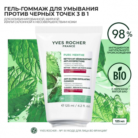 Гель-Гоммаж Для Умывания Против Черных Точек 3 в 1 бережно очищает и отшелушивает кожу без пересушивания, очищает поры и сокращает черные точки. В состав входит Перечная Мята БИО с освежающими свойствами, выращенная на наших полях в Ля Гасийи согласно правилам агроэкологии.