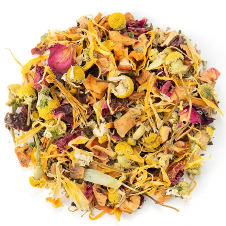 Состав: яблоко, шиповник, лист ежевики, чабрец, мелисса, цветы ромашки, лепестки красной розы, лепестки календулы