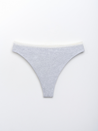 Стринги из мягкого хлопкового трикотажа — прекрасный выбор для ценителей женственного нижнего белья. Кружевная окантовка с фестонами и благородный меланжево-серый оттенок создают аккуратный, сдержанный, но очень женственный образ. Открытая линия ягодиц подчеркивает силуэт. Мягкая резинка не натирает, а небольшое количество эластана в составе делает белье долговечным и эластичным.