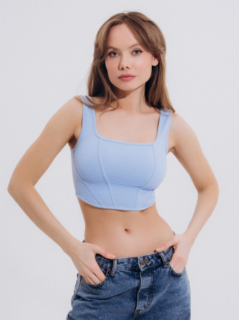 Он выполнен в голубом цвете с фактурной тканью и с широкими бретелями.