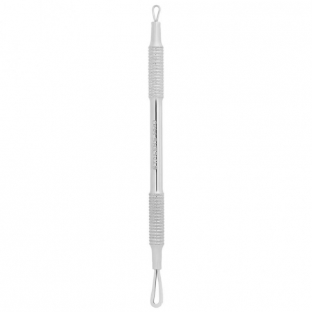 Петля косметологическая КИ-03ст производства Сталекс имеет две рабочие поверхности. С одной стороны располагается плоская петля для избавления от прыщей и милиумов. С другой стороны расположена петелька меньшего диаметра, которая поможет избавиться от черных точек.