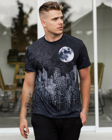 Мужская футболка, целиком покрытая принтом. С центральной части рисунок переходит на рукава и спину. Это картины, созданные художниками творческой лаборатории Sahar Art lab. Мы сами их придумываем и воплощаем в жизнь. А значит, похожих вы не найдёте ни у кого. Наносятся принты методом сублимационной печати. Это специальная техника, которая впечатывает краски в волокна ткани. Получаются износостойкие изделия, которые не боятся частых стирок в стиральной машине. Цвет остаётся свежим и ярким на протяжении нескольких сезонов.