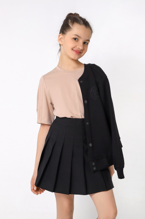 Футболка для девочек модной объемно-силуэтной формы, с вертикальным отстроченным швом по центру переда. На рукавах также выполнены декоративные вертикальные отстроченные швы и глубокие защипы по низу.