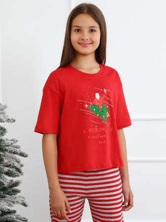 Футболка детская из гладкокрашеного трикотажного полотна "кулирка", модного силуэта, слегка укороченная, свободного покроя, с приспущенным плечом, втачными рукавами длиной до локтя, горловиной овальной формы, обработанной втачной планкой и принтом в центре переда. По шву втачивания планки настрочена отделочная строчка. Низ изделия и нижние срезы рукавов обработаны швом вподгибку.