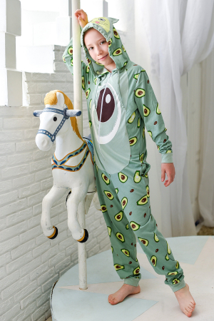 Комбинезон детский на молнии, с капюшоном, стилизованный в виде «Авокадо Кэт», двумя боковыми карманами в швах. Втачные рукава и низ изделия на манжетах, на полочке вставка с принтом, имитирующая манишку. На капюшоне принт, шнурок. Манишка, хвостик, передняя часть капюшона, ушки, шнур и манжеты выполнены из отделочной ткани.