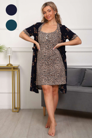 Комплект женский, из двух видов ткани, основной и компаньон, халат с сорочкой. Халат прямого силуэта, на запах. Рукав короткий. В боровых швах карманы, низ прямой. Сорочка на бретелях. Расклешённая к низу. Спинка гладкая. Перед с подрезом под грудью. Лиф с защипами по линии груди, и двумя декоративными пуговицами. Низ изделия прямой