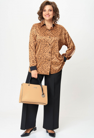 Блузка женская из атласной ткани прямого силуэта со спущенным плечом. По бокам закругленные разрезы. Рукав с запахом и разрезом, на манжете. Застежка – планка на петли и пуговицы. Воротник на отрезной стойке. Стойка и манжета из отделочной ткани. По спинке идет отрезная кокетка.