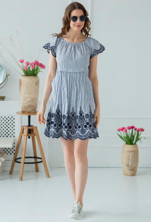 Платье расширенного силуэта с коротким рукавом из текстильного хлопка с бордюрной вышивкой. Горловина расширенная с резинкой по краю. По переду диагональные карманы в шве с и горизонтальный подрез с декоративной складкой и сборкой. По спинке полурельефы, по центральной части декоративная складка и сборка.