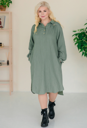 Платье прямого силуэта с длинным рукавом с манжетой. Горловина округлая с рубашечным воротником. По переду застежка на планку на пели пуговицы и отрезная кокетка с пришивной декоративной пластиной. Карманы в боковом шве.