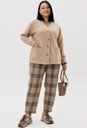 Комплект состоит из кардигана и брюк. Кардиган прямого силуэта со спущенным плечом. По низу спинки и полочки идет отрезной пояс. Застежка- планка с пуговицами. По полочке идут накладные карманы. По низу рукава- манжет. Брюки из текстильной ткани, прямые, зауженные к низу за счет защипов. Пояс на резинке, по бокам карманы.