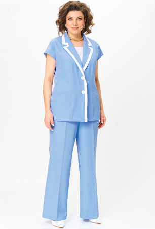 Костюм состоит из жакета и брюк, выполнен из однотонной ткани, в качестве отделки использована однотонная ткань, контрастная по цвету к основной ткани. Жакет прямого силуэта. Полочка жакета с двубортной застежкой на петли и пуговицы. Горловина V-образной формы, с отложными лацканами и воротником пиджачного типа. Воротник и край борта с притачной отделочной планкой из контрастного цвета. Полочка с вертикальными рельефами. Спинка со средним швом. Рукава цельнокроеные, короткие.
