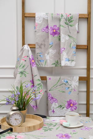 Набор полотенец Бабочки и цветы. Изготовленный из материала рогожка и 100% хлопка, этот набор состоит из трех полотенец размером 60*48 см. Уникальный рисунок Цветы и бабочки придаст вашей кухне особый шарм. Каждое полотенце имеет свой уникальный принт, что делает этот набор еще более привлекательным. Полотенца не только красивы, но и функциональны. Они отлично впитывают влагу и быстро сохнут, что делает их идеальным выбором для использования на кухне.