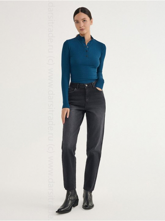 Черные джинсы mom с эффектом потертости и необработанным краем. Высокая посадка, подчеркивающая талию, умеренно свободный силуэт mom. Застежка на пуговицу и молнию, скрытую планкой, шлевки для ремня. Модель с пятью карманами, мягкий eco-friendly деним с эффектом потертости.