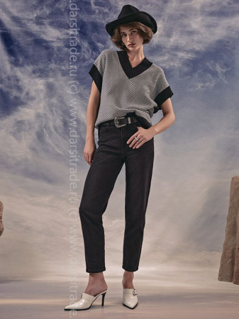 Черные джинсы умеренно свободного силуэта mom с эффектом потертости из eco-friendly денима c высокой посадкой, подчеркивающей талию. Застежка на пуговицу и молнию, скрытую планкой. Модель с пятью карманами из мягкого eco-friendly денима премиального качества.
