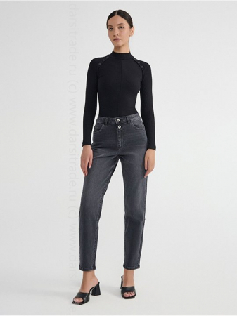 Джинсы умеренно свободного силуэта mom с высокой посадкой, подчеркивающей талию. Застежка на 2 пуговицы и молнию, скрытую планкой. Модель с пятью карманами из мягкого денима с эффектом потертости.