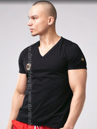 Мужская футболка в милитари стиле. Шеврон на груди с камуфляжной символикой, принт на рукаве в виде военного знака различия. Модный силуэт, V-образный вырез горловины, рукава подвернуты наружу.